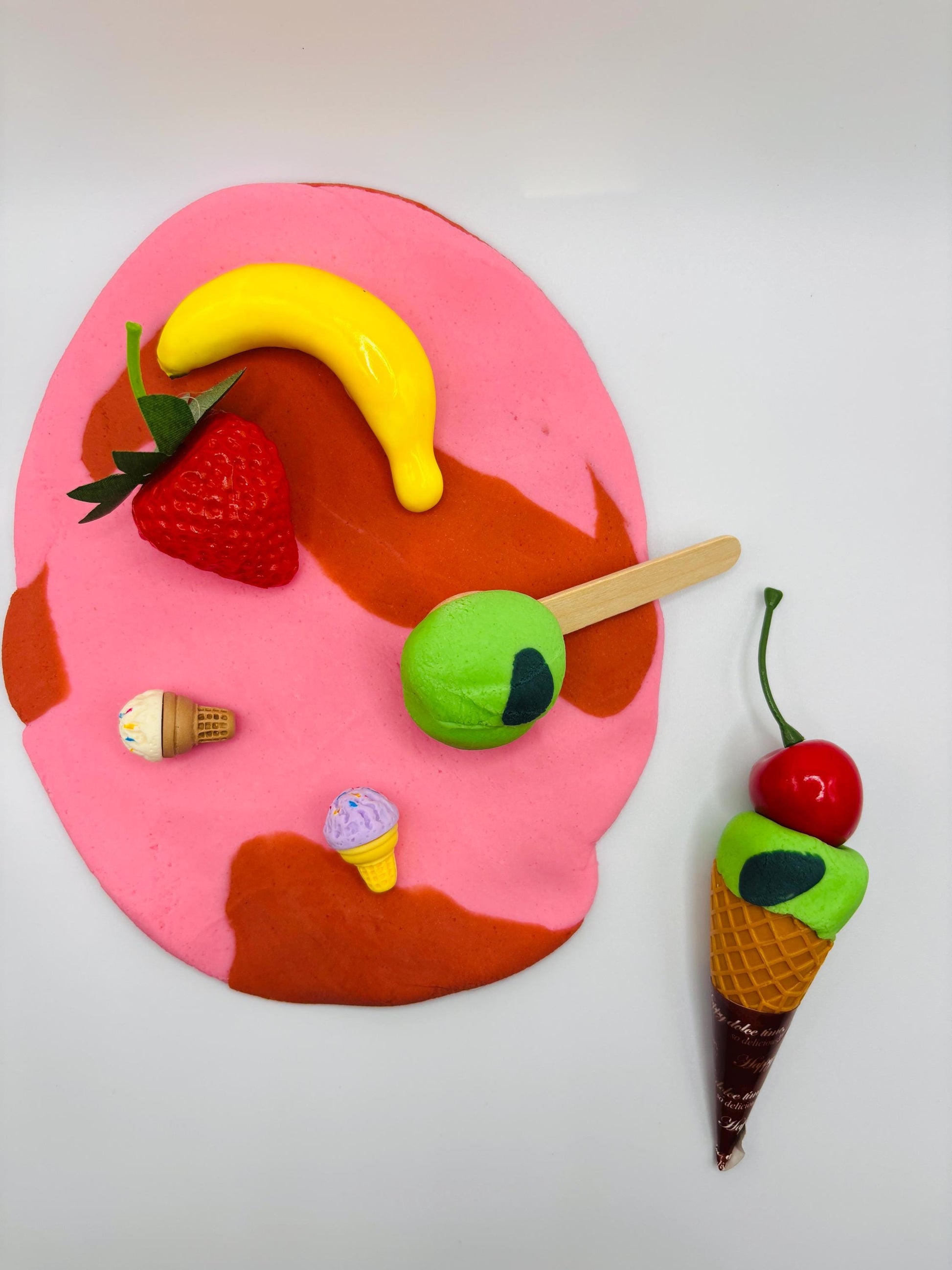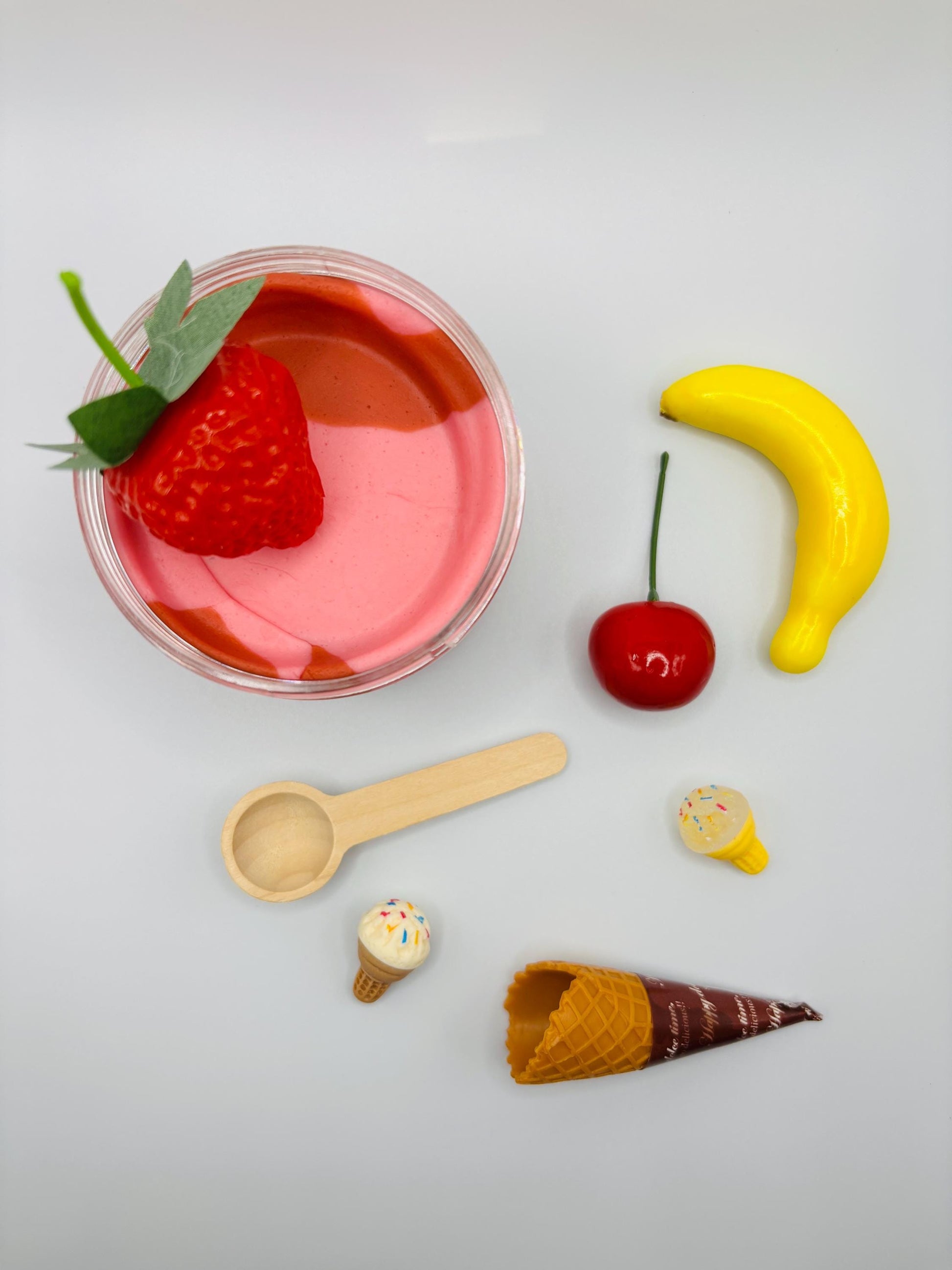 This adorable double-sided jar is packed with everything your little one needs to whip up their own pretend sweet treats. One side features 9 oz of soft, strawberry-scented play dough in a beautiful pink and red swirl—just like real strawberry ice cream! The other side holds all the fixings for imaginative dessert play, including a mini play cone, a strawberry, a cherry, and a banana to create their own pretend sundaes and cones.
