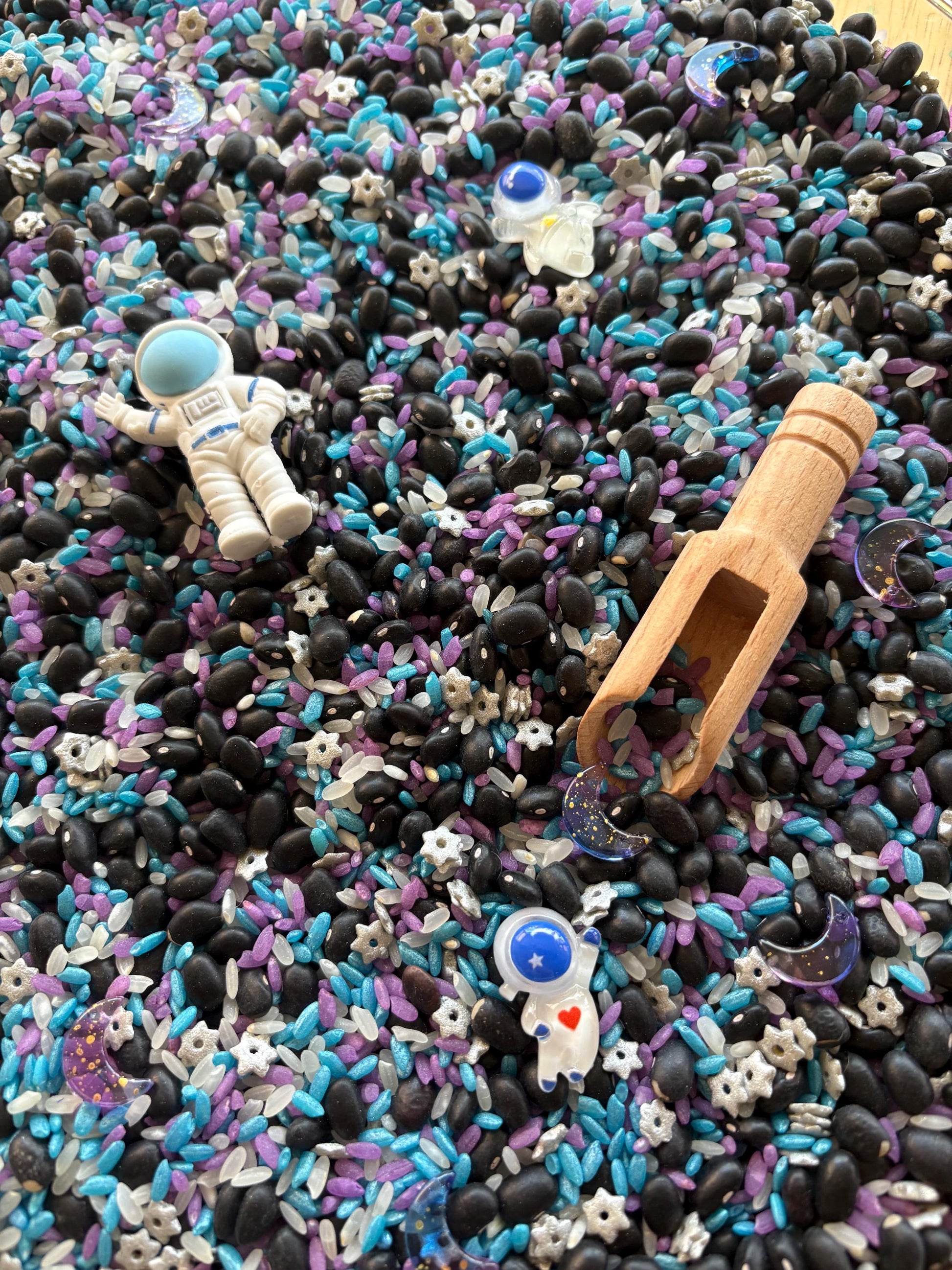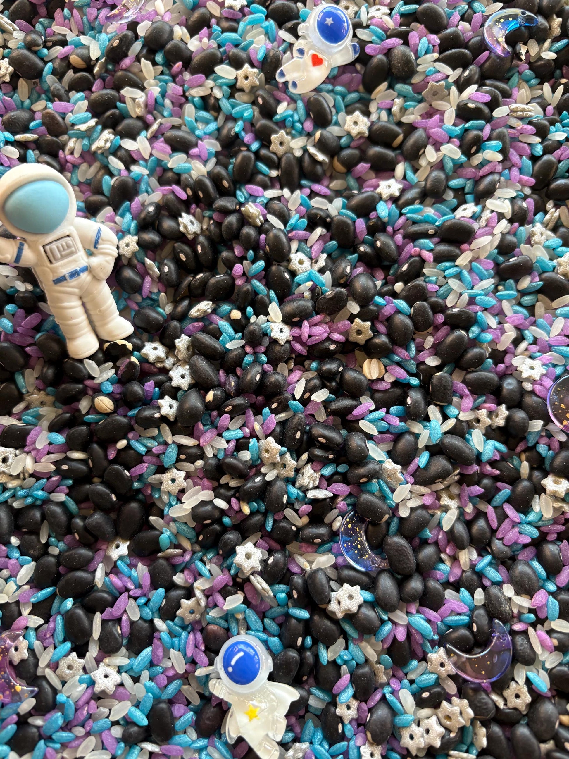 Get ready to launch your child’s imagination into orbit with our Space Sensory Kit, featuring a galaxy of colors, textures, and scents! This hands-on kit is filled with vibrantly colored, scented rice and black beans to create a rich, outer space-inspired sensory base that’s perfect for scooping, pouring, and exploring.